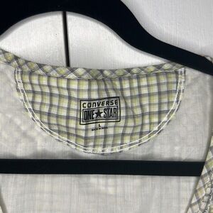 Style: converse, yellow, black, and pink plaid wrap dress, ruffle sleeve details, two tiered ruffles on bottom hem, adjustable depending on how tight you want to wrap the dress, edgy but feminine