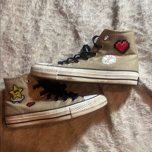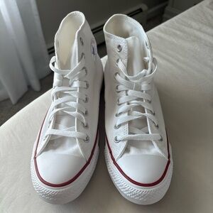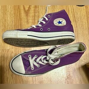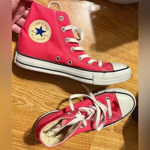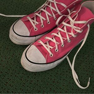 Bold pink Converse high-tops. Classic design with iconic logo. Perfect for everyday wear.