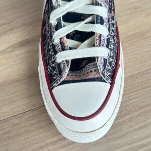 The French fashion icon puts her effortlessly elegant spin on the premium Chuck 70. Blending cool luxury style cues with classic Converse details, the limited-edition design captures the essence of Isabel Marant’s laid back but elevated aesthetic. An all-over bandana print, logo overlays, and custom details create a distinctive carefree vibe.