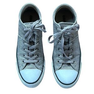These Converse sneakers feature a striking gray and white finish, offering a classic low-top look. The shoes are designed with white laces, a durable rubber toe cap, and a comfortable rubber outsole, making them perfect for everyday wear.