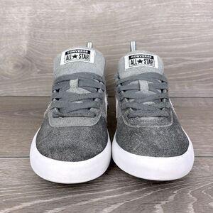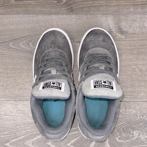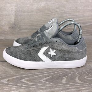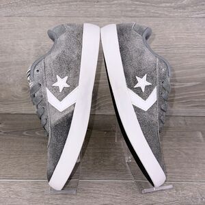 Converse Point Star Ox Cool Gray Leather White Women’s Sz 7 Low Top Skate Sneakers in good condition. These Converse sneakers showcase a sleek gray and white design, featuring a durable construction ideal for skateboarding. The low-top style is complemented by a classic white midsole and the iconic Converse star logo in white, offering a minimalist yet stylish look. Get these nice looking sneakers today, ladies.