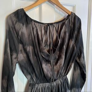 100% polyester Long sleeve Swoop back with tie 19in chest 11in waist, but is Stretchy and adjustable Item #100