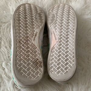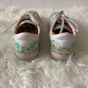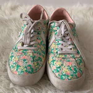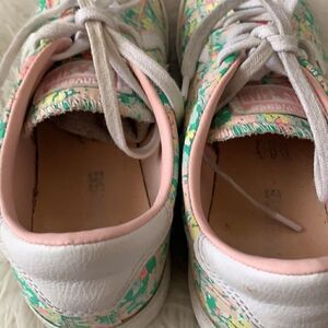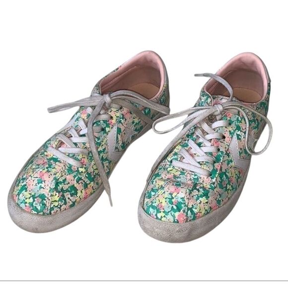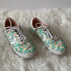 Converse painted canvas floral print low top sneakers, size women's size 8 .These shoes feature a color palette of green, pink, yellow and white. In very good pre-owned condition with normal wear.Please see all photos for reference.
