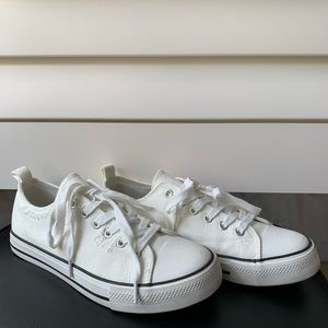 - distressed denim-like material - worn once - size 8 but fits like a 9/9.5 in Women’s