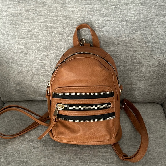 MMS Design Studio convertible bag. Vegan leather, brown bag. Can convert from a backpack into a shoulder bag. Zipper pocket on the outside of the bag and one inside the bag. There is also a small pocket inside the bag. Like new.