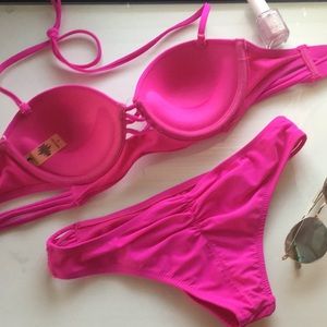 Hot pink strappy push up bikini swim set. π Converts from halter to strapless. Ruching in back. π Worn only a couple times, just rotating my closet. Make an offer! π₯ Fast shipping! π¦