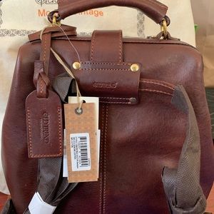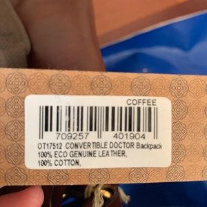 A 100% Eco Genuine Leather Doctor Backpack. It’s in the color coffee and all the tags are included as well as the cotton bag.