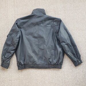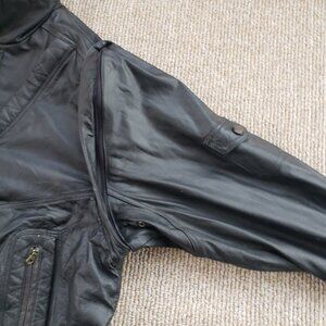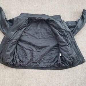 J. McGriffin leather motorcycle jacket. Removeable sleeves. Multiple pockets. Quilted interior lining. One of the brass snaps has corrosion (see photos), otherwise good vintage condition.