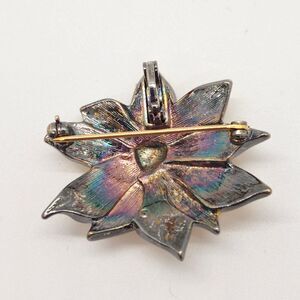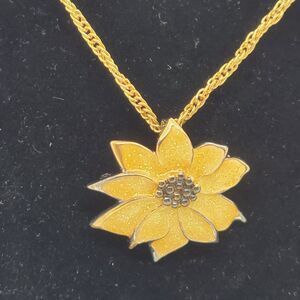 Metal & enamel gold glitter poinsettia flower pin or pendant (chain not included), maker unknown but distributed by Avon in 1987. This has the versatile feature of having both a pendant bail and a pin back so it can be worn as a brooch or as a necklace. Nicely made medium sized pin/brooch. In this color you could wear it for Christmas or anytime. Comes in a new jewelry box, great for storage or gifting. Box size varies.