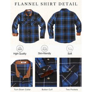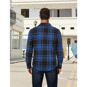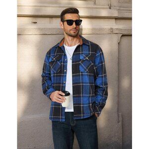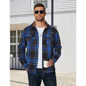 Coofandy Men Black Blue Flannel Plaid Button Down Jacket Shirt with Pockets