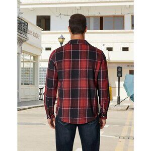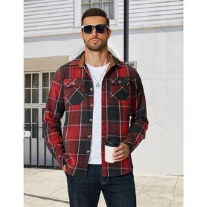 Coofandy Men Black Red Flannel Plaid Button Down Jacket Shirt with Pockets