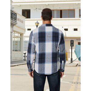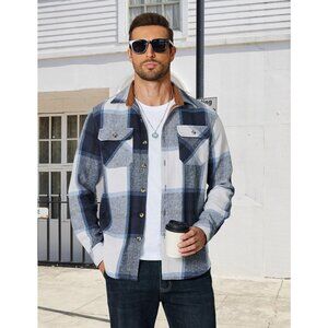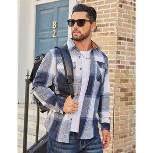 Coofandy Men Blue Flannel Plaid Button Down Jacket Shirt with Pockets