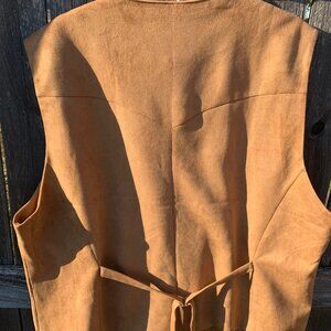 A Coofandy vest made with soft polyester new with tags. Vest has that western look and has 2 pockets and snap button closures. Back strap is ready to be adjusted as needed. Dimensions are 26 inches across and 25 inches long.