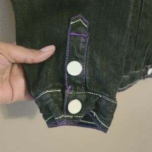 Unisex. Purple and yellow stitching on collar, wrists and hems. Snap buttons down the front, on chest pockets and at wrists. Front slant pockets. Excellent pre-owned condition; no flaws.