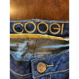 This jeans from Coogi is in excellent condition. It is in a blue color in a medium wash denim fabric. It features; fading and whiskering, button and zipper closure, straight legs, rhinestone embellished, belt loops, mid-rise cut, distressed details and is crfated from a cotton and spandex blend.