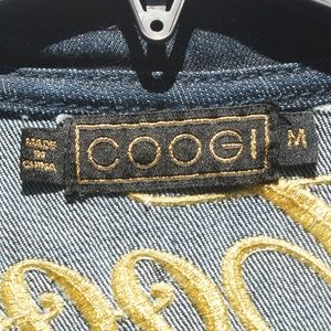 This is a really good condition Coogi denim one piece. Has zip fly with button closure and 5 snaps up the center front. Two small chest pockets with snap closures, 2 on the rear that are a little bigger. 4" zip at the leg opening on both legs. Embroidered logo on front and back both have reflective stone detail. Belt loops at the waist. Women's size Medium.