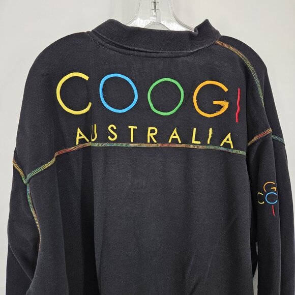 Embroidered multicolor COOGI Australia logo across back, small COOGI logo on chest, sleeve embroidery, rainbow accent stitching, multicolor stripe under placket, and hem embroidery
