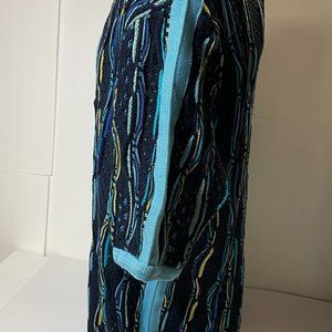 Coogi, Knit-textured short sleeve sweater, Navy Blue with light blue, aqua, and yellow accents throughout. Size XL, in excellent condition. Perfect for the taller man. Front measurement from neck to bottom is 30 inches. Back measurement from nape to bottom is approximately 31 inches. Short sleeve measurement from shoulder seem to tip is approximately 13 inches; and the under side of sleeve from armpit to tip is 6 inches.