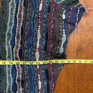 This pre-owned Coogi Y2K Vintage sweater is in excellent condition, showcasing a vibrant 3D knit pattern. Made with mercerized cotton, this men's size large collared sweater combines style and comfort.