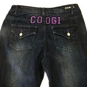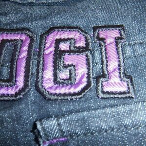 Features: Purple logo embroidery on the inside back, silky purple logo applique on the back, patches on the front, very dark blue material, there are no identifying style fit, perhaps straight leg (look at pic)