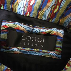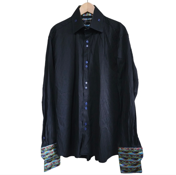 Coogie Classic Button Down Shirt with Accent Cuffs. Print on cuffs is reminiscent of the well known Coogie sweaters. Purple buttons. Monochromatic striped black shirt. Size 3XLT. Great condition. Non-smoking home.