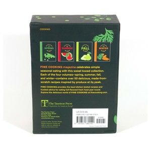 Each of the 4 books focuses on seasonal recipes and includes Starters, Salads, Soups, Mains, Sides, and Desserts. Each book also contains a recipe index. The books are small - measuring approximately 5" x 6". The set was published by The Taunton Press and is from the editors and contributors of Fine Cooking . The box does have some very minor wear, but cosmetically still very nice. All of the books are in very good condition.