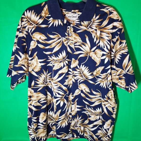 Cooke Street Mens Large Polo Shirt Navy/Tan Cotton Golf Hawaiian Aloha Tropical