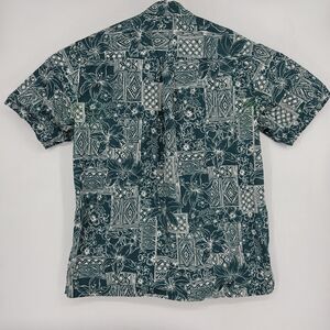 Cooke Street Shirt Mens Large Hawaiian Green Tapa Camp Button Up All Over Print. Good pre owned condition, has discoloration on the back, please see all the pictures before buying.