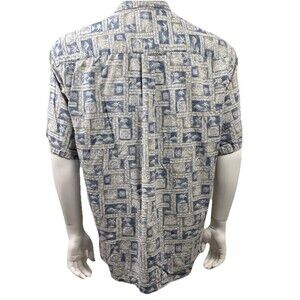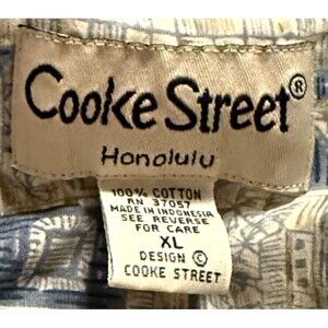 Vintage Cooke Street Hawaiian Shirt in Size XL. Aloha Wear with all-over tiki hut, palm tree, ocean, and island tapa block print in cool blues and beige tones. Short sleeves, spread collar, straight hem with side slits, wood-look buttons, single chest pocket, and 90s single stitch construction. Fraying on sleeve hems adds to the vintage look please see photos. Lightweight, breathable 100% cotton. Perfect for collectors, vintage lovers, or anyone looking to bring a laid-back, tropical vibe to their warm weather and travel wardrobe.