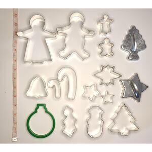 Lot of 16 (15 stainless steel, 1 plastic) Christmas/holiday cookie cutters. Gingerbread family (4), 2 trees, 4 stars, 2 candy canes, snowman, bell, ornament, and holly. Some used, some not. All are in pretty good shape and usable, but due to time and storage, some have minor pitting and rust spots. See second photo for sizing.