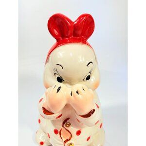 This vintage Peek-A-Boo cookie jar by Van Tellingen features a charming baby bunny in red and white pajamas. A rare mid-century collectible, it adds a whimsical touch to any kitchen or collection.