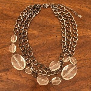 Gunmetal layered chains and chunky, clear acetate stones. Cool statement piece!