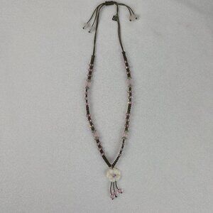 Cookie Lee Floral Pink Glass Beads with Lotus Flower Macrame Adjustable Closure Necklace. Blush pink beads with silver accents and a larger lotus shaped flower bead charm as the focal point with 3 dangles. Small logo tag. The pretty brown braided slide cord features the endless closure style for a comfortable fit. The synthetic cord provides durability. Light weight and great for travel. Preowned; in excellent condition. Please see pictures for approximate measurements. Coastal, beachy, beach wedding, Hawaiian inspired, fairy, dainty, romantic, poolside, cruise, Y2k, Bohemian.
