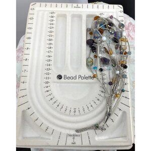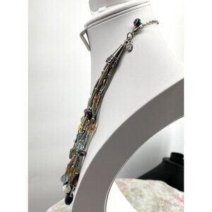 This Cookie Lee necklace is a vintage multi-strand piece adorned with colorful beads. It has an adjustable chain that can be lengthened from 18 to 22 inches. The metal, lucite, and AB colored crystal beads add a touch of sophistication.