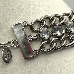 Cookie Lee necklace features a bold double row curb chain design accented with sparkling clear rhinestones. Crafted in silver tone metal, the necklace has an adjustable length with a lobster clasp closure and signed hang tag.
