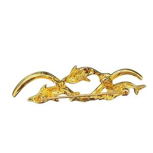 Adorable brooch with gold dolphins and silver toned accent. In great condition with no noted callouts on the bed.