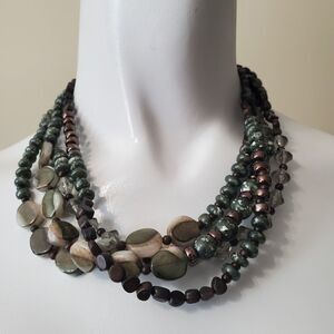 Cookie Lee four-layer bohemian style brown and green beaded necklace.