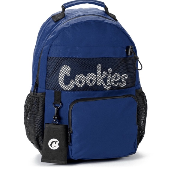 Stylish blue backpack with Cookies logo. Features mesh pockets and a front zip pocket.