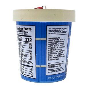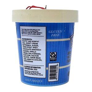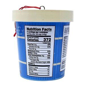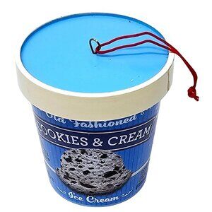 The ornament features a realistic looking container of old fashioned cookies & cream ice cream. This metal and plastic ornament measures 3" tall by 2.75" in diameter.