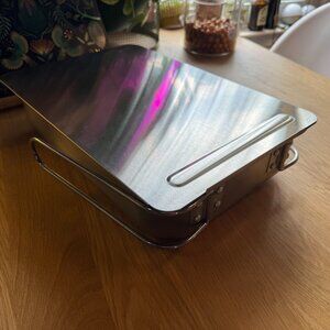 Add smokey flavor, indoors, on your stovetop with this stainless-steel smoker. Can also work on an open flame. You can do more with this than smoking, including roasting, poaching, steaming. This smoker uses wood chips (pick your flavor: mesquite, apple, cherry, hickory) and add your ingredients: ribs, chicken, salmon, tofu and get that great smoky flavor infused in a fraction of the time of a traditional smoker using your gas or electric stove. Requires no fats or oils and keeps your food juicy. Easy to clean, dishwasher safe. This versatile cookware also works in the oven or on an outdoor grill. Hint: start your smoking on the stovetop to put high heat on the chips where they start smoking and finish-off in the oven.
