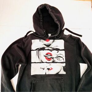 Very cozy- perfectly broken in with some wash fading to the color. Has a drawstring at hood, kangaroo pocket. 3 stacked Images are of a woman smoking , wearing red lipstick.