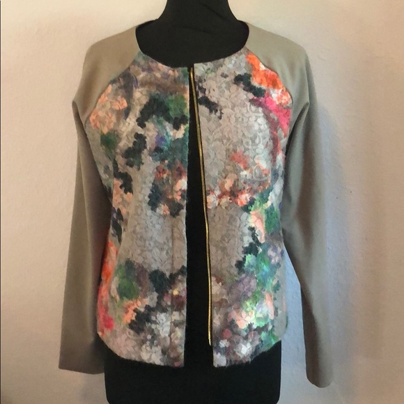 Bought this on PM a few weeks ago but too small for my bust. Very small XL. More like a M/L in size. Beautiful muted multicolor front. Gold perfect condition zipper. 2 pockets. Taupe sleeves & back.