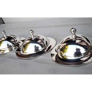 The bowls measure approximately 6" across by 5" high. The bowls are in good condition with no dents and some small tarnish patina that could be polished out even more and minor wear associated with age and usage. All three lid components are perfect and shiny.