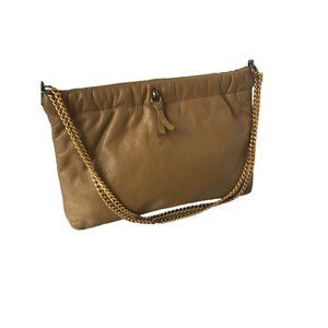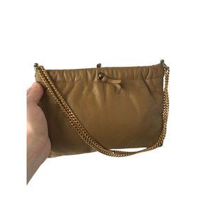 This matching glove and handbag set has a vintage appeal that still feels modern and relaxed. This bag made of leather in a dijon tan color has a hinge snapping closure to keep all of your belongings safe inside. The glove set is in a matching dijon tan color , delicate leather suede perfect for sipping tea or going on joy rides.
