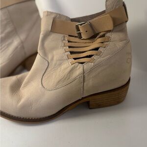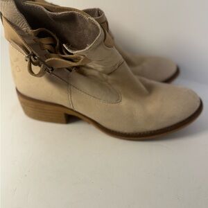 These Coolway ankle booties in a soft cream color feature a Western-inspired design with a distinctive laced detail on the side. The short, stacked wooden heel and rounded toe offer a blend of style and comfort, while the pull-on style with elastic side panels ensures easy wear.