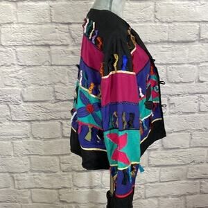 Very unique and rare vintage find! Jacket is soft and comfortable and lined on the inside. It has a colorblock design with complimentary shades of fabric attached and knotted throughout. There are also florets and embroidered flowers giving it a vet bohemian look. The care tag has been removed, but I’m listing this as a size large. Please pay close attention to the measurements. Dry Clean Only.