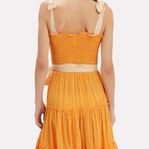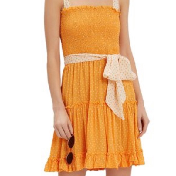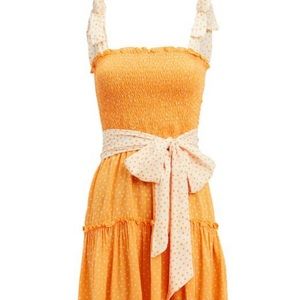 A smocked mini dress with feminine shoulder ties in a contrast fabric.