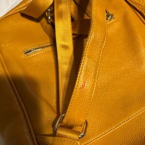 There is one spot on back strap looks like a little nail polish and on other strap a little gathered on one spot but depends on you need the strap might not even show. I have pictures of both. Little wear on piping. But the inside is very clean and nice the leather is very nice quality. 2 front pockets that zip and inside there is 2 pockets that zip and 2 slot pockets for cell phone. One zip pocket on back. Measurements are 16 inches long and 13 inches wide