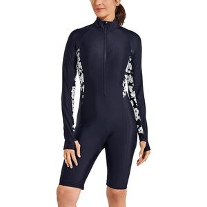 Coolibar Alana Knee Length Swimsuit Long UPF 50+ Black Floral Colorblock Size L