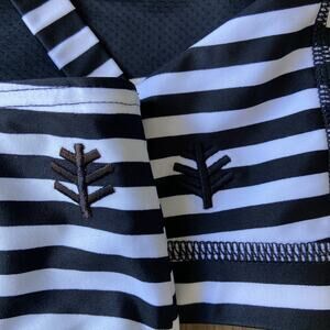 Get ready to soak up the sun safely with this stylish Coolibar bikini! This women's size L bikini features a classic black and white striped design.